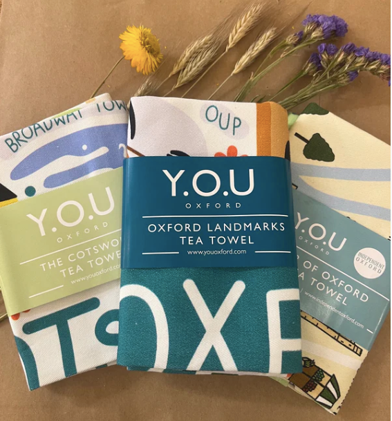 Our local landmarks collection of tea towels includes Oxford, London, Stratford-upon-Avon, The Cotswolds, Royal Leamington Spa & Warwick, England, and a map of Oxford, as well as our unique Y.O.U Make a Difference design supporting body positivity.