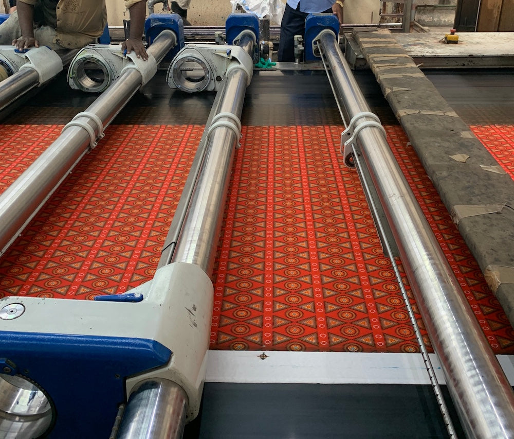 All our underwear is dyed in another factory in Tiruppur using vast buckets of low-impact dyes. Our patterned materials are more complex and exciting. It is done with this rotary printing machine where it is rolled through various colours and prints in order to create our colourful designs!